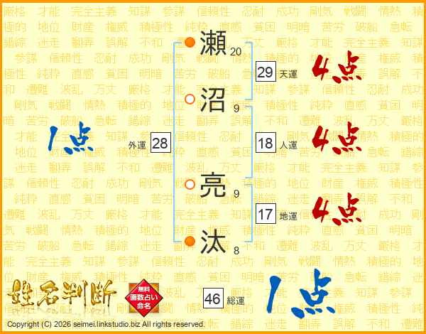 瀬(20画)沼(9画) 亮(9画)汰(8画)