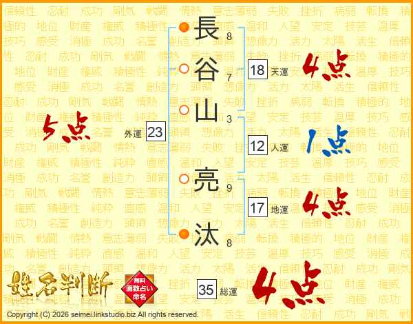 長(8画)谷(7画)山(3画) 亮(9画)汰(8画)