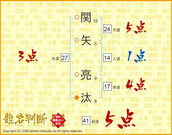 関(19画)矢(5画) 亮(9画)汰(8画)