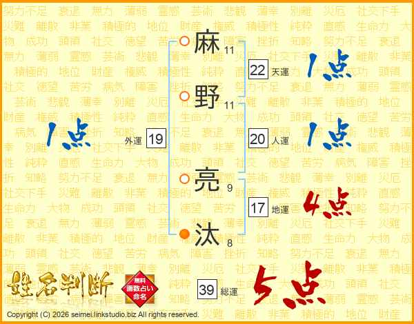 麻野亮汰さんの総運は39画の5点!