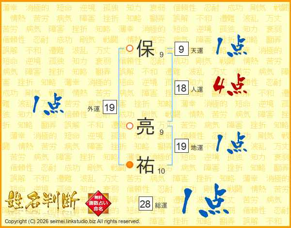 生活面を象徴する運勢です。外部から受ける影響力を表し、結婚運、家庭運や職場、環境への順応性を表します。総運から人運を引いた画数。姓や名が1文字の場合を除く。