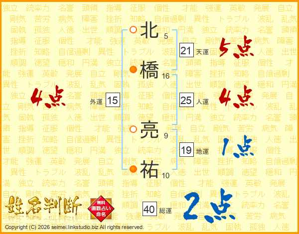 北(5画)橋(16画) 亮(9画)祐(10画)