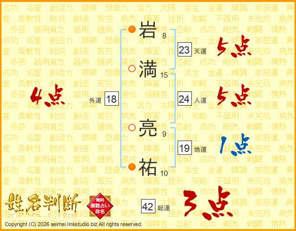 岩(8画)満(15画) 亮(9画)祐(10画)