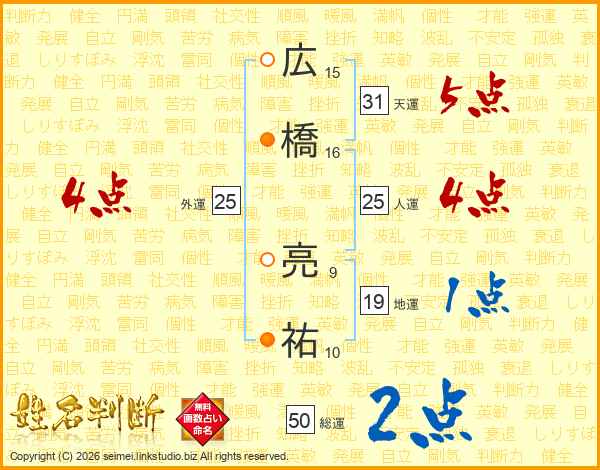 広(15画)橋(16画) 亮(9画)祐(10画)