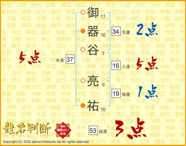 御(11画)器(16画)谷(7画) 亮(9画)祐(10画)