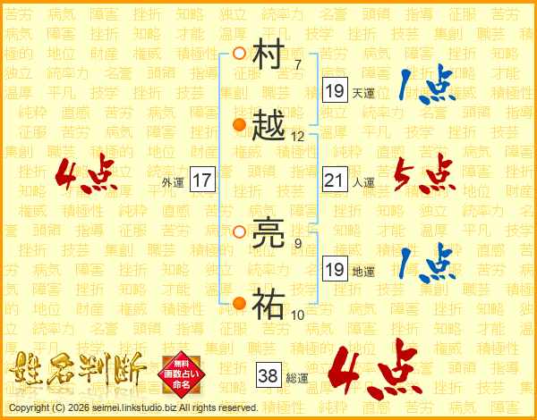 生活面を象徴する運勢です。外部から受ける影響力を表し、結婚運、家庭運や職場、環境への順応性を表します。総運から人運を引いた画数。姓や名が1文字の場合を除く。