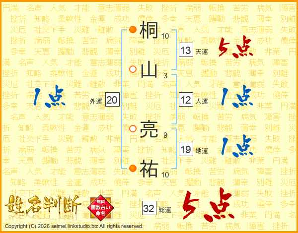 桐山亮祐さんの総運は32画の5点!
