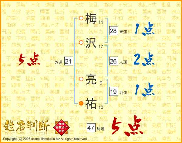 梅(11画)沢(17画) 亮(9画)祐(10画)
