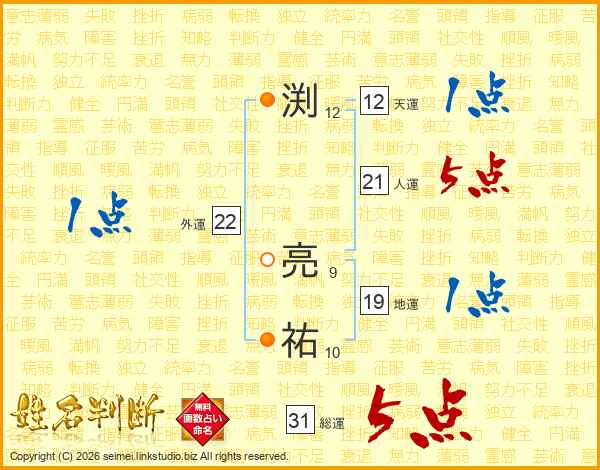 生活面を象徴する運勢です。外部から受ける影響力を表し、結婚運、家庭運や職場、環境への順応性を表します。総運から人運を引いた画数。姓や名が1文字の場合を除く。
