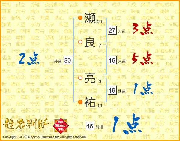 瀬(20画)良(7画) 亮(9画)祐(10画)