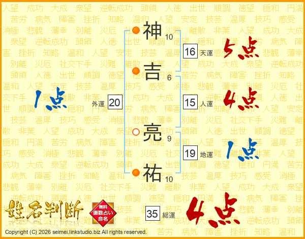 神(10画)吉(6画) 亮(9画)祐(10画)