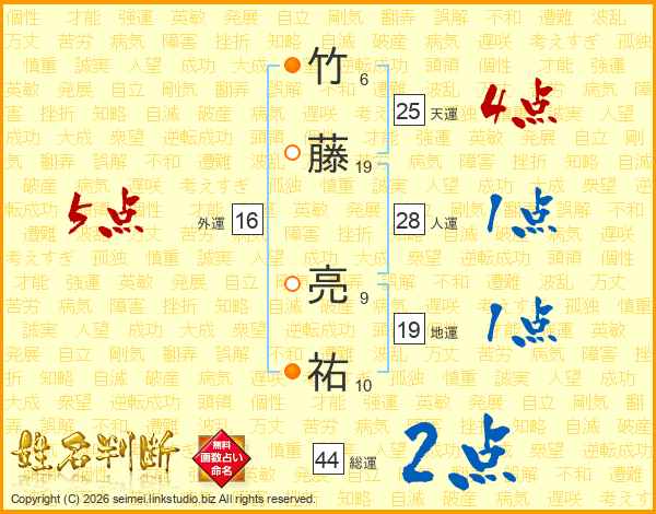 竹(6画)藤(19画) 亮(9画)祐(10画)