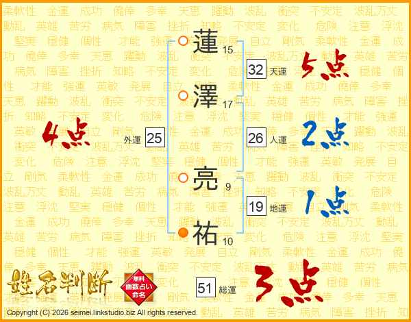 蓮(15画)澤(17画) 亮(9画)祐(10画)