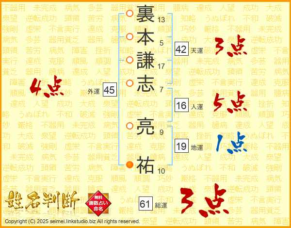 裏(13画)本(5画)謙(17画)志(7画) 亮(9画)祐(10画)