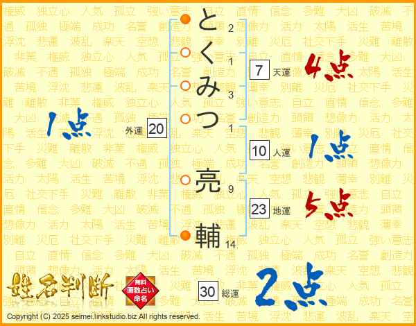と(2画)く(1画)み(3画)つ(1画) 亮(9画)輔(14画)