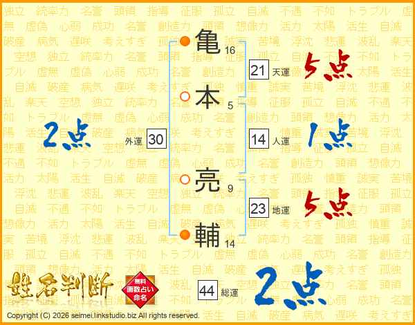 亀(16画)本(5画) 亮(9画)輔(14画)