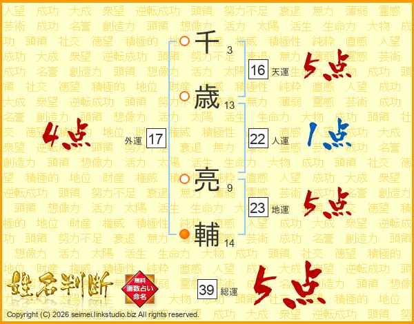 千(3画)歳(13画) 亮(9画)輔(14画)