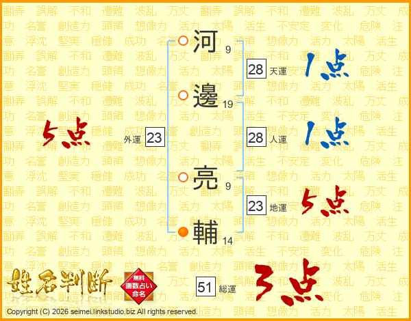 河(9画)邊(19画) 亮(9画)輔(14画)