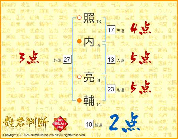 生活面を象徴する運勢です。外部から受ける影響力を表し、結婚運、家庭運や職場、環境への順応性を表します。総運から人運を引いた画数。姓や名が1文字の場合を除く。