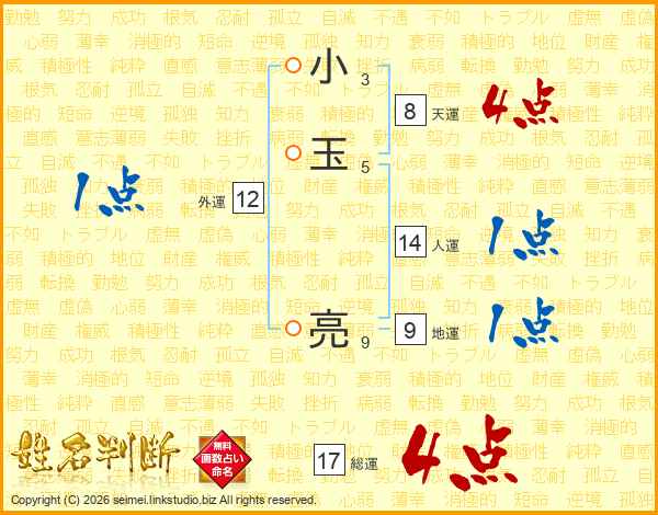生活面を象徴する運勢です。外部から受ける影響力を表し、結婚運、家庭運や職場、環境への順応性を表します。総運から人運を引いた画数。姓や名が1文字の場合を除く。