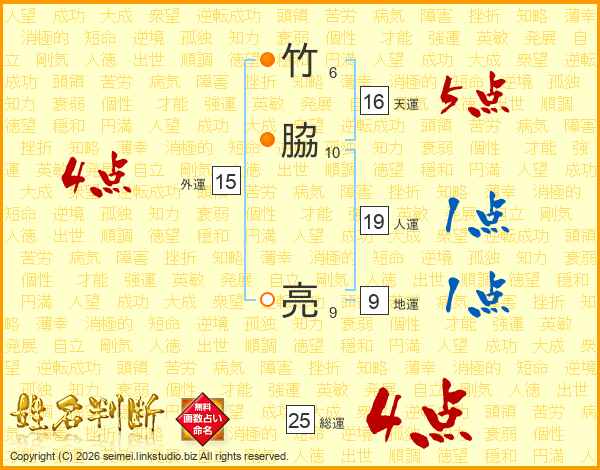 生活面を象徴する運勢です。外部から受ける影響力を表し、結婚運、家庭運や職場、環境への順応性を表します。総運から人運を引いた画数。姓や名が1文字の場合を除く。