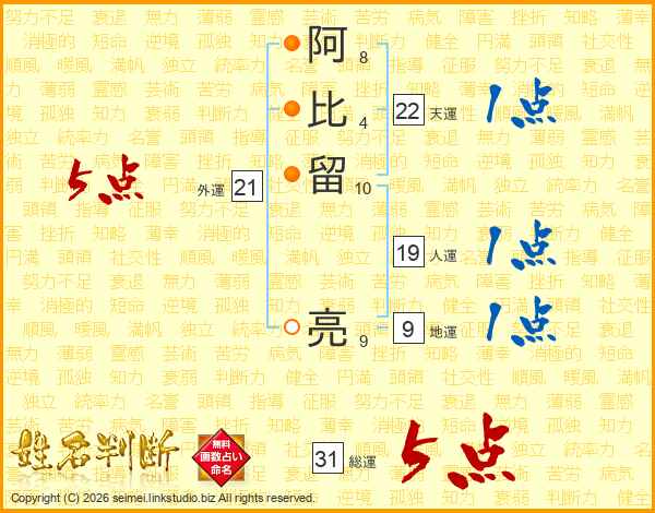 生活面を象徴する運勢です。外部から受ける影響力を表し、結婚運、家庭運や職場、環境への順応性を表します。総運から人運を引いた画数。姓や名が1文字の場合を除く。