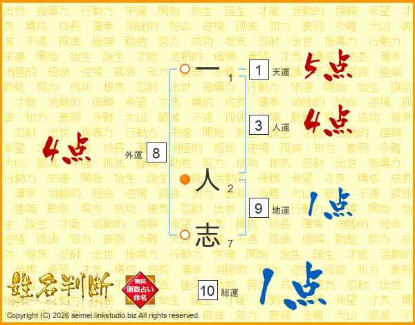 生活面を象徴する運勢です。外部から受ける影響力を表し、結婚運、家庭運や職場、環境への順応性を表します。総運から人運を引いた画数。姓や名が1文字の場合を除く。