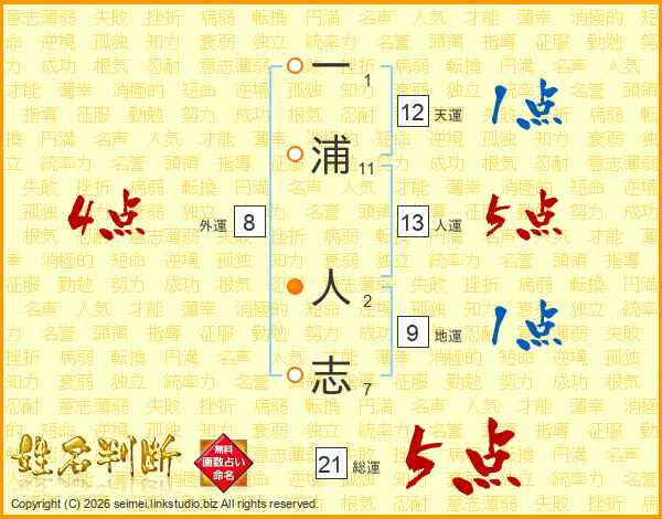 一浦人志さんの総運は21画の5点!