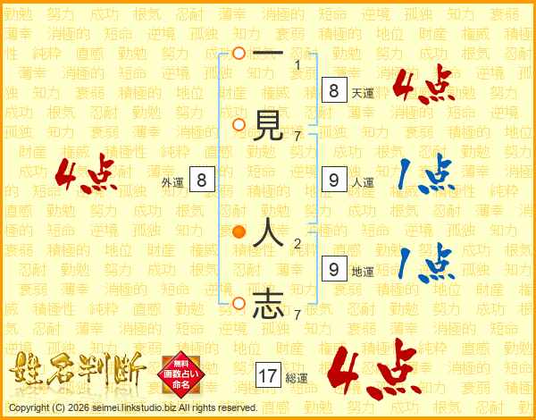 生活面を象徴する運勢です。外部から受ける影響力を表し、結婚運、家庭運や職場、環境への順応性を表します。総運から人運を引いた画数。姓や名が1文字の場合を除く。