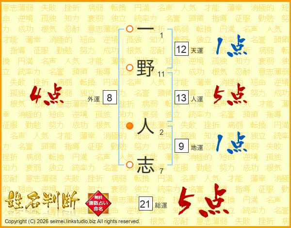 生活面を象徴する運勢です。外部から受ける影響力を表し、結婚運、家庭運や職場、環境への順応性を表します。総運から人運を引いた画数。姓や名が1文字の場合を除く。