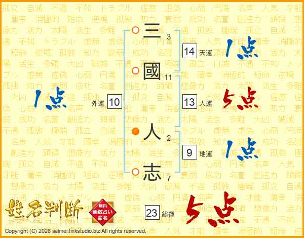 生活面を象徴する運勢です。外部から受ける影響力を表し、結婚運、家庭運や職場、環境への順応性を表します。総運から人運を引いた画数。姓や名が1文字の場合を除く。