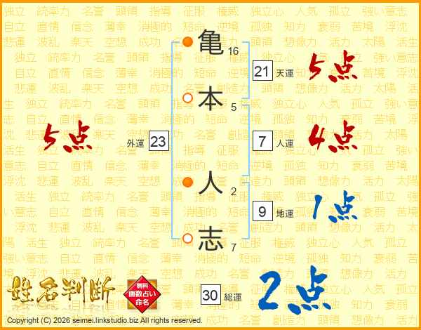 亀(16画)本(5画) 人(2画)志(7画)