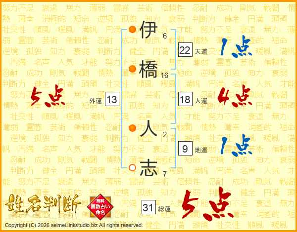 伊(6画)橋(16画) 人(2画)志(7画)