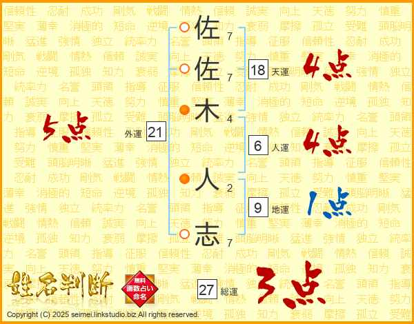 佐(7画)佐(7画)木(4画) 人(2画)志(7画)