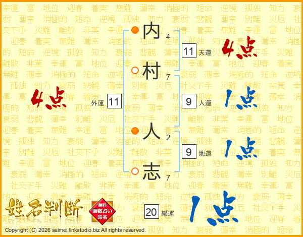 あなたの人生を表す1番重要な運勢です。生涯を通じて影響する総合運となり、主に50歳以降の晩年期に影響を及ぼします。苗字と名前の合計画数。
