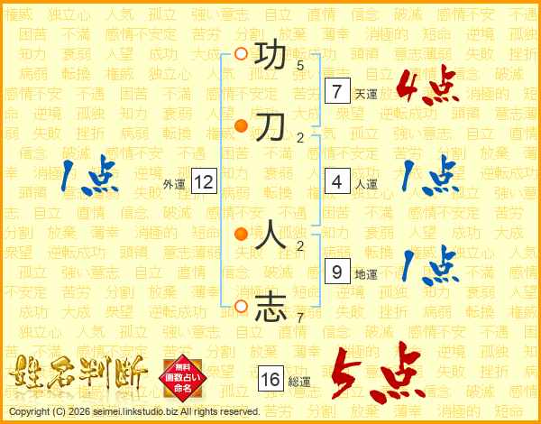 生活面を象徴する運勢です。外部から受ける影響力を表し、結婚運、家庭運や職場、環境への順応性を表します。総運から人運を引いた画数。姓や名が1文字の場合を除く。