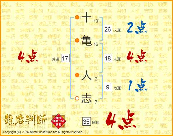 十(10画)亀(16画) 人(2画)志(7画)