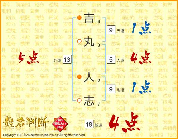 あなたの人生を表す1番重要な運勢です。生涯を通じて影響する総合運となり、主に50歳以降の晩年期に影響を及ぼします。苗字と名前の合計画数。
