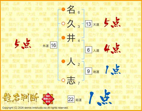 名(6画)久(3画)井(4画) 人(2画)志(7画)