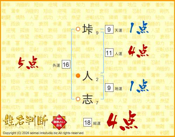 あなたの人生を表す1番重要な運勢です。生涯を通じて影響する総合運となり、主に50歳以降の晩年期に影響を及ぼします。苗字と名前の合計画数。