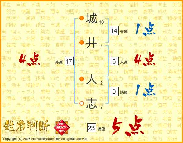 生活面を象徴する運勢です。外部から受ける影響力を表し、結婚運、家庭運や職場、環境への順応性を表します。総運から人運を引いた画数。姓や名が1文字の場合を除く。