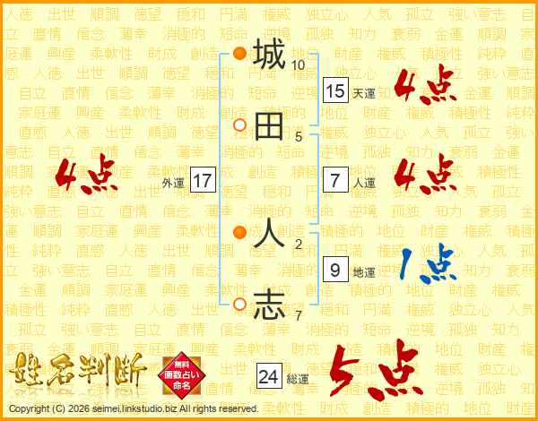 生活面を象徴する運勢です。外部から受ける影響力を表し、結婚運、家庭運や職場、環境への順応性を表します。総運から人運を引いた画数。姓や名が1文字の場合を除く。