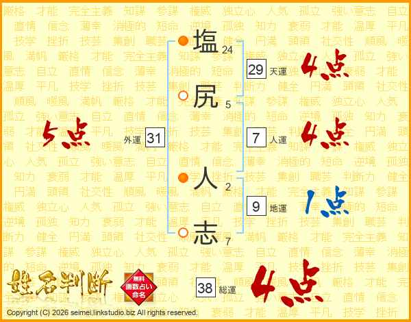 塩(24画)尻(5画) 人(2画)志(7画)