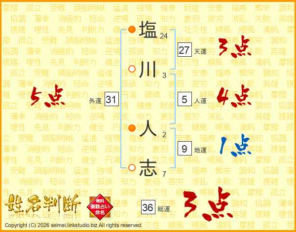 生活面を象徴する運勢です。外部から受ける影響力を表し、結婚運、家庭運や職場、環境への順応性を表します。総運から人運を引いた画数。姓や名が1文字の場合を除く。