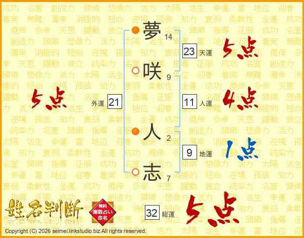 夢咲人志さんの総運は32画の5点!