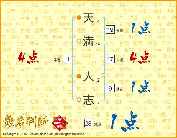 生活面を象徴する運勢です。外部から受ける影響力を表し、結婚運、家庭運や職場、環境への順応性を表します。総運から人運を引いた画数。姓や名が1文字の場合を除く。