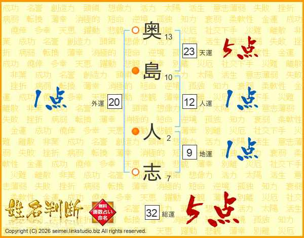 奥(13画)島(10画) 人(2画)志(7画)
