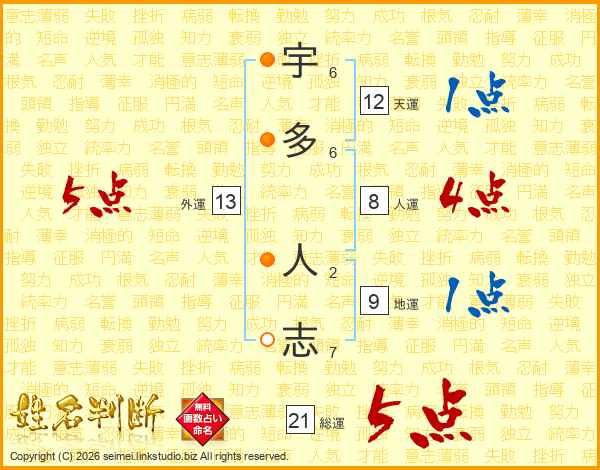 生活面を象徴する運勢です。外部から受ける影響力を表し、結婚運、家庭運や職場、環境への順応性を表します。総運から人運を引いた画数。姓や名が1文字の場合を除く。