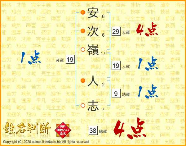 安(6画)次(6画)嶺(17画) 人(2画)志(7画)