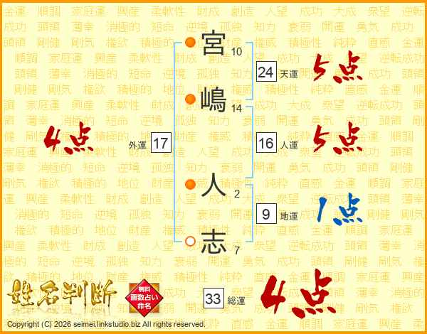 宮(10画)嶋(14画) 人(2画)志(7画)